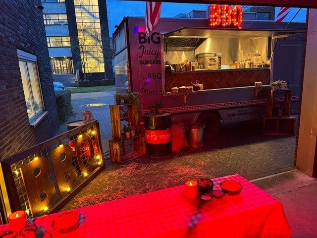 Als je aan een Western feest denkt, denk je aan Tommy's barbecue truck, die de geur van langzaam gegaard vlees door het evenement verspreidt. Deze truck stond voor de roldeur en werd het hart van het feest. Het Amerikaanse streetfood, perfect passend bij het thema, bracht de smaken van het Wilde Westen rechtstreeks naar de gasten met dit menu vol heerlijke klassiekers:
