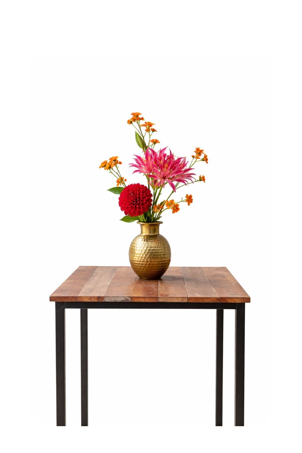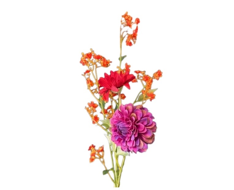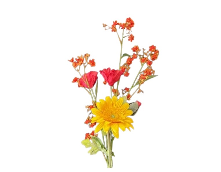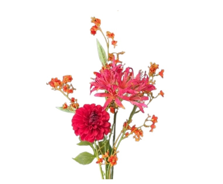 De combinatie van de speelse oranje tak en de wisselende bloemen zorgt voor een levendig, eigentijds accent op tafel. Elk boeketje is uniek, maar altijd herkenbaar in kleur en uitstraling.