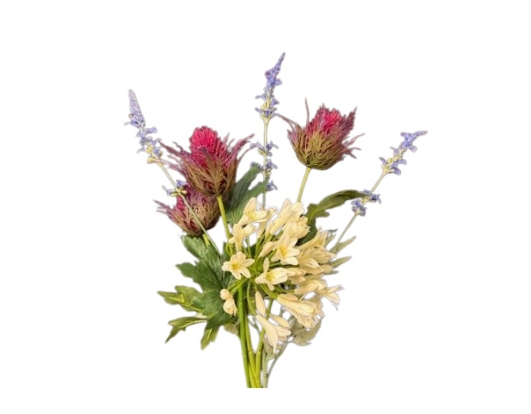 Elk boeketje bestaat uit een vaste basis van distel en lavendel, gecombineerd met een wisselende statement bloem.
